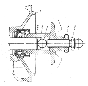 Opravu si môžeme urobiť aj sami, ak využijeme nápad motoristu z mesta D~amčire (obr. 41). Pozície Sa 6sú puzdro a nastavovacia skrutka, ktoré sú oporou vahadla ventilov. Do stredového otvoru obežného kolesa čerpadla chladiacej kvapaliny vložíme ložiskovú guľôčku 4 s priemerom 12 mm, potom do neho naskrutkujeme na doraz puzdro .S n do neho skrutku 6. ~bežné koleso takto ľahko stiahneme z hriadeľa 2, ktorý je umiestnený v telese 1.